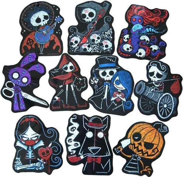 A variety of 10 stickers for your car, skateboard, laptop, luggage, text books, or whatever!ย With a glossy coat to protect from water and sun damage, you will instantly recognise the cartoonish horror of the iconic Akumu Ink style. Designs are not random. What you see in photos below is exactly what you will receive.