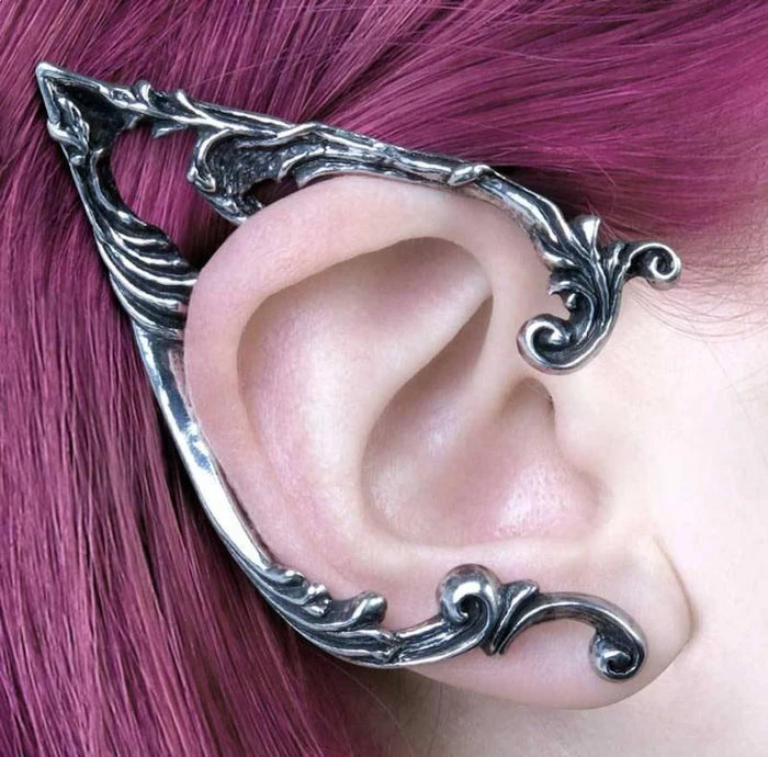 A polished, antiqued pewter pointed elf-ear-shaped ear-wrap fashioned from decorative, floral scroll work and neatly framing the ear – can be gently squeezed to comfortably fit your own ear; fastened at the lobe with one surgical steel ear-post.