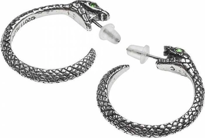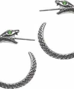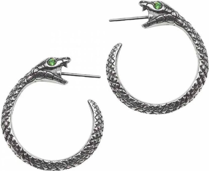 A pair of detailed, 1″ (25mm) diameter pewter ear-hoops of a serpent with green Swarovski crystal eyes, appearing to swallow their own tails when worn.