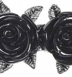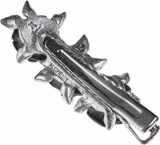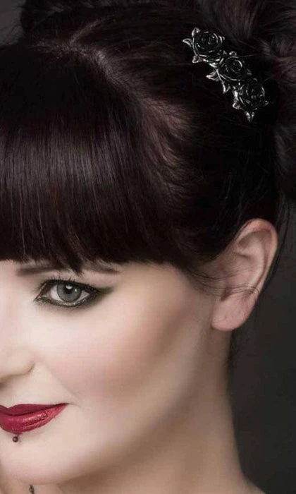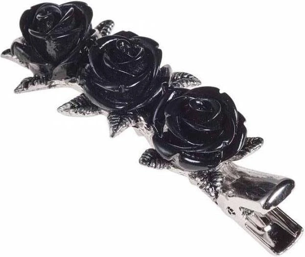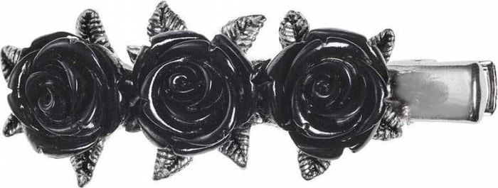 Hair clip fashioned as a row of three pewter roses with black resin blooms, on a 2 cm stainless steel slide clip.