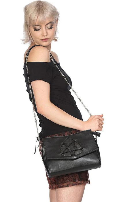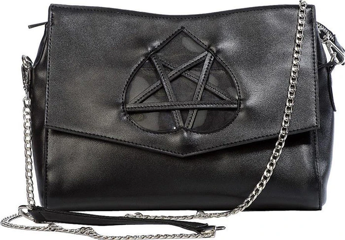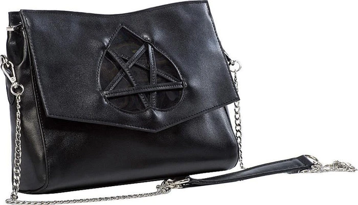 Day night or both; how will you wear yours? This glamorous Gothic handbag come with silver tone chain strap and chain detail. An upturned heart and pentagram detail adorn the front flap.ย