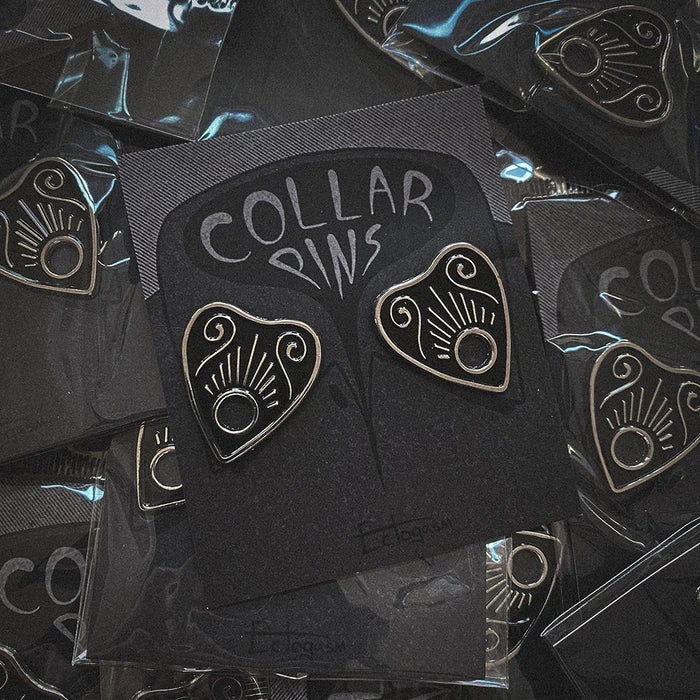 An essential accessory for ghost whisperers. This jewellery set features two elegant planchette enamel pins in silver and black. They are the perfect size to wear on your collar points.