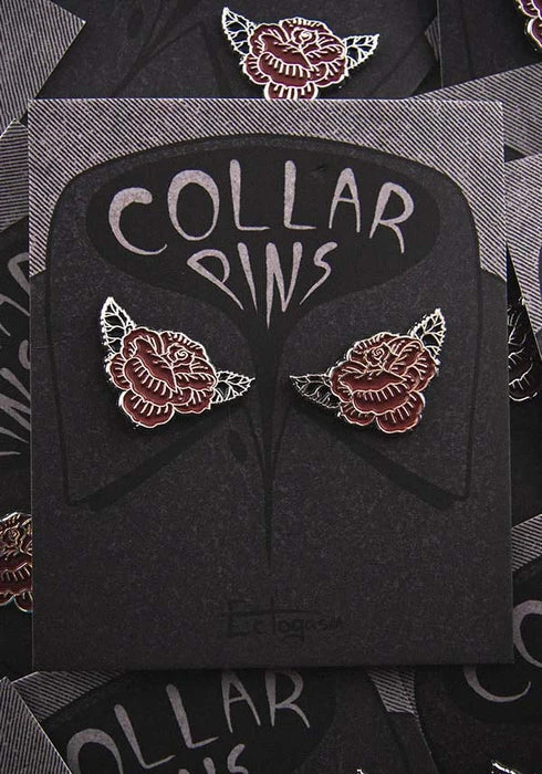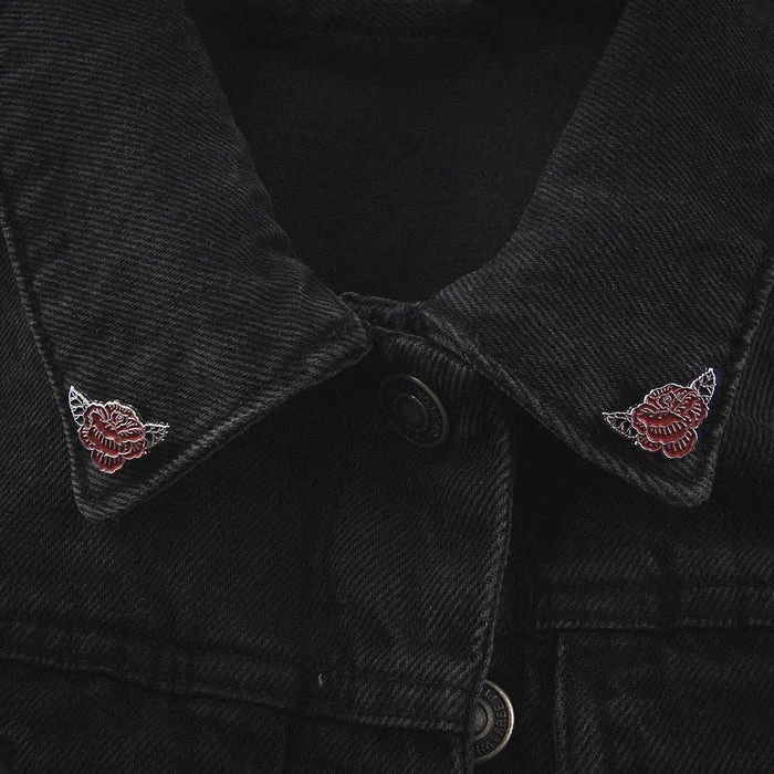 It’s all about the details! This beautiful pin set adds a hint of gothic elegance to any outfit. Wear them on the collar of a denim jacket, dress shirt, or flannel. Features red roses with black leaves drawn in a traditional tattoo inspired art style.ย
