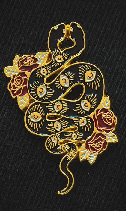 This magical enamel pin features a two headed snake with illuminated eyes adorning its coiled body. On each side of the snake are beautiful red roses.