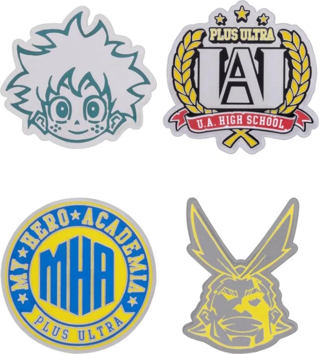 This collection of enamel fill pins includes Izuku Midoriya (Deku), All Might, and two insignia pins: U.A. High School Plus Ultra and MHA Plus Ultra.