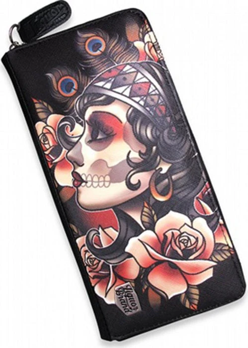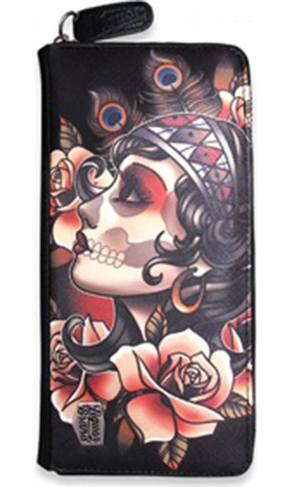 This stunningย Dia de los Muertos inspired designย features a sugar skull mystic surrounded by peacock feathers and rose flowers. The Mystic Rose Wallet from Liquorbrand is amazing for everyday use!