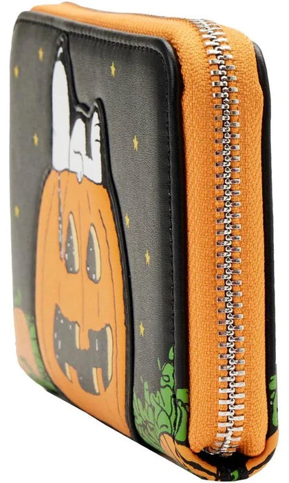 Pick the perfect spot in the pumpkin patch and wait for the Great Pumpkin in style with this Loungefly Peanuts Great Pumpkin Snoopy Zip Around Wallet. Enjoy a fun-filled outing while Snoopy keeps watch over your valuables. On the front of this charming wallet, Snoopy snoozes on top of a spooky jack-oโ-lantern, and under a star-filled sky. On the back, youโll find a frightfully fun pumpkin patch, under a full moon-sky, dotted with stars and bats. Open the wallet up, and on the inside, youโll find 4 slots for holding cards, 1 clear slot for holding your ID, and billfold slots. A die-cut shape of a bat is a delightfully devilish surprise. Itโs the perfect accessory for keeping vigil on Halloween nightโor for turning everyday outings into spirited adventures. This wallet is an officially licensed Peanuts product.