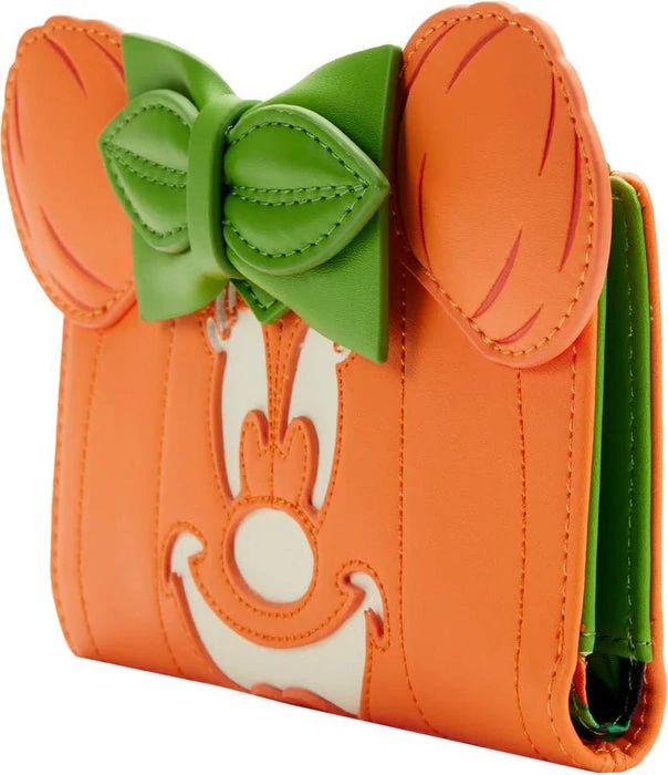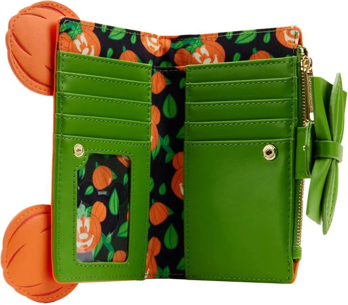 What a treat! Have a scary good fright with the Loungefly Disney Glow Face Minnie Pumpkin Flap Wallet! When the lights go out, Minnieโs mouth, eyes, and nose glow! Green trim for Minnieโs bow adds a fresh complementary colour to the jack-oโ-lantern orange face and ears, brought to life with applique and embroidered details. On the inside of this wallet, there are 4 slots on either side for holding cards and 1 clear slot for holding your ID. Itโs the perfect accessory for keeping your valuables safe during your Halloween adventuresโor for adding wonderfully wicked mischief when visiting all your regular haunts.