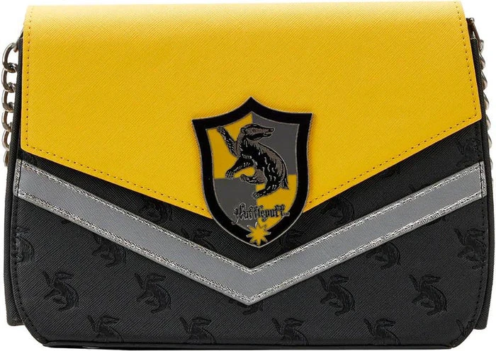 Enter the halls of Hogwarts School of Witchcraft and Wizardry in spellbinding style with this Loungefly Harry Potter Hufflepuff Chain Strap Crossbody Bag. This alluring crossbody bag incorporates the yellow and black Hufflepuff House colors in a chevron pattern. The Hufflepuff crest is on a metal rivet, and the badger logo appears again as a debossed all-over-print on top of a black base. The accordion-style sides reveal accents of strands of silver, and a silver chain strap tops off the look. Itโs the perfect accessory for attending a potions class or Quidditch matchโor for turning everyday outings into enchanting moments!