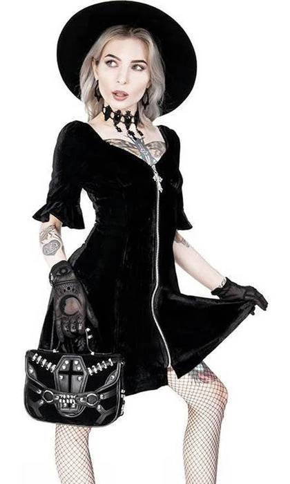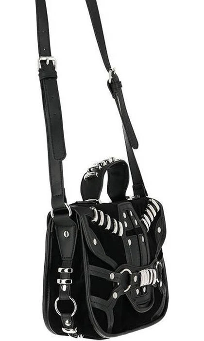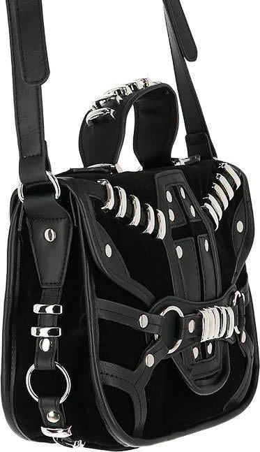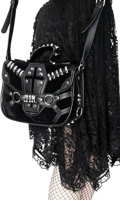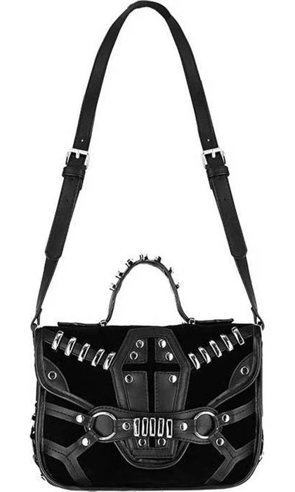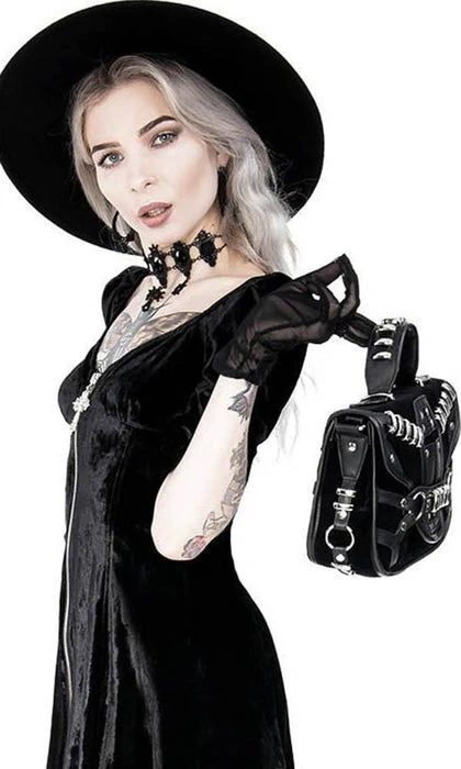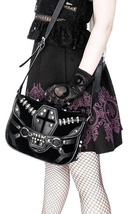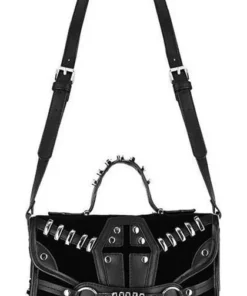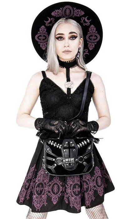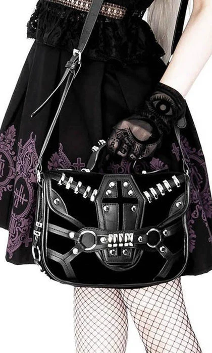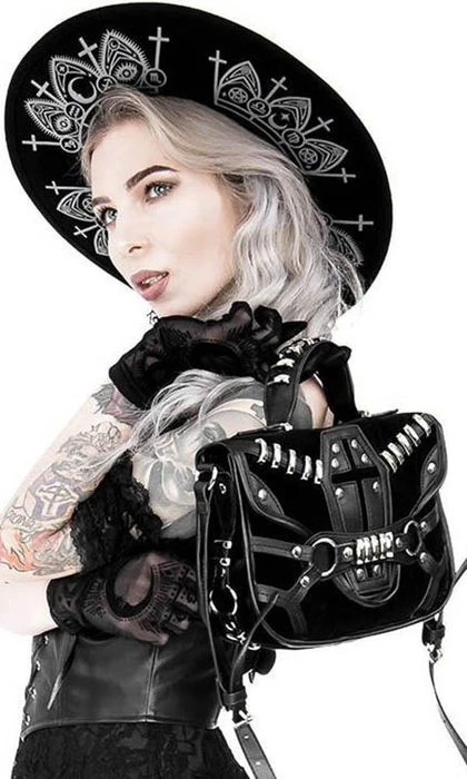 This incredibleΒ Coffin Handbag is decorated with vegan leather trim, soft black suede and gothic metal hardware. It features a stunning coffin design, numerous pockets and is perfect for everyday use!