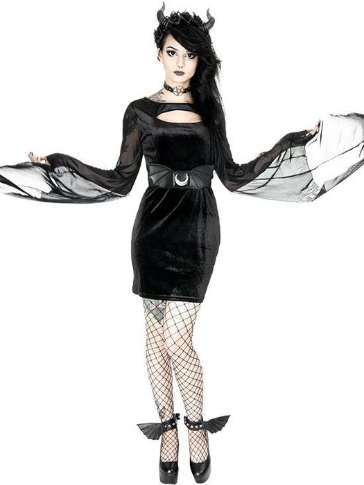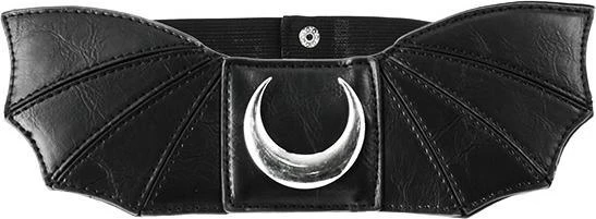 A waist belt with bat wings and crescent moon hardware. Made of black vegan leather with an elastic band. Perfect accessory for every plain black look; not just for goths!
