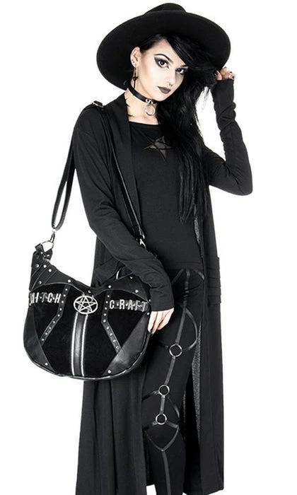 Pentagramย hobo bag made of solid, blackย velvet and vegan leather decorations.