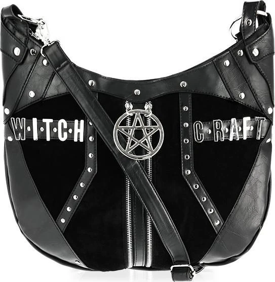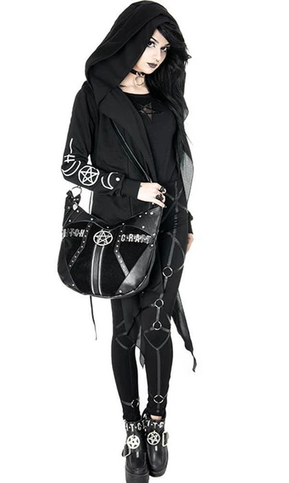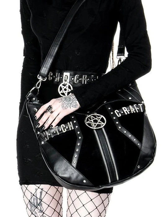 In the centre of the bag there isย double zipper with pentagram hardware. Surrounded with vegan leather panels, the bag comes with a long, adjustable arm strap for easy shoulder carry. On the inside is black soft lining with two pockets (a big zipped one and other smaller one). There is an additional pocket on the back. Perfect for any witch who loves cute accessories.