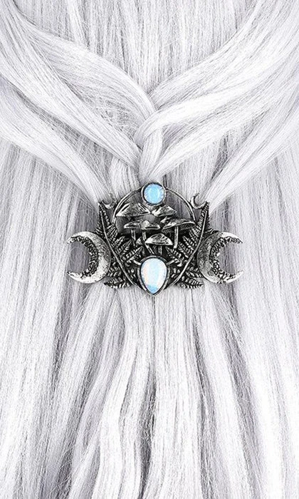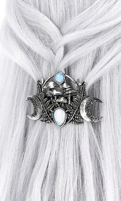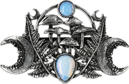 Anย intriguing creation composed of fern leaves, magic mushrooms and a crescents on the sides. Magic Forest Hair clip, perfect to give away,ย crafted in zinc alloy and embellished with moon stones.