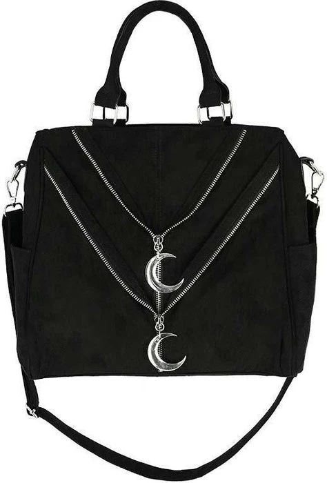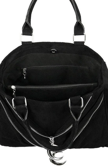 An icon worthy of investment.ย Double Zipped Moon Toteย is a head-turning handbag for the gothic woman on-the-go. Crafted from black faux suede, theย roomy silhouette is embellished with lustrous Crescent Moons and zipped details. Splitย internalย compartment make organisation a breeze, whileย silver hardware andย moon charms promise to addย magical flair to any ensemble. Make glamour part of your everyday, taking it from desk to dinner with ease.ย Carry yours by the top handle or opt for the removable crossbody strap to go hands-free.