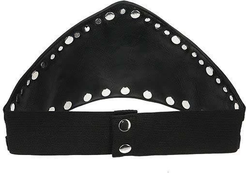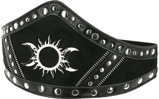 We present an elegant take on the waist belt with this PU leather-trimmedย gothic design.ย This Goth waist belt has been crafted fromย faux suedeย andย decorated with a contrasting Pu leather details.ย Triple Goddess Motifย and rivet hardware stands out against the black background.ย The style has an adjustable strap that fastens around the waist, closes on the back with a snap detail.ย Let yours cinch a billowing black dress or a pencil skirt for a magical look!