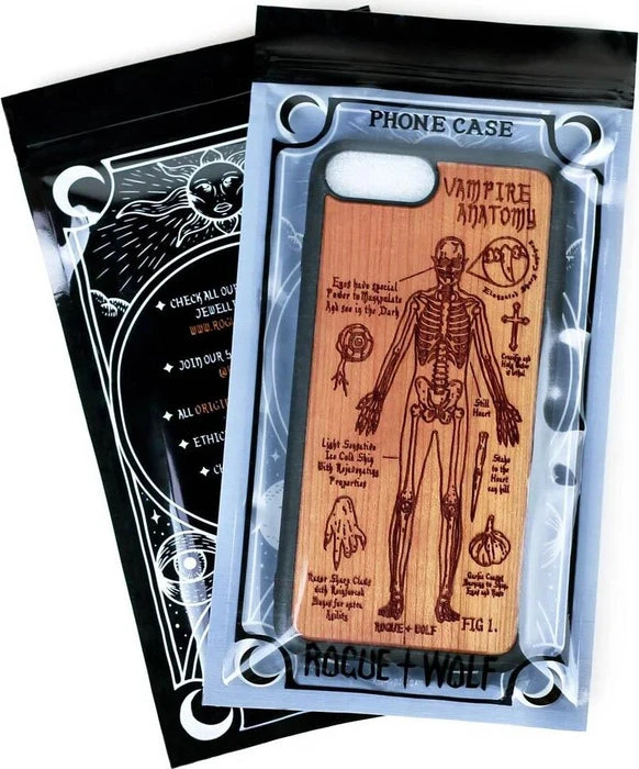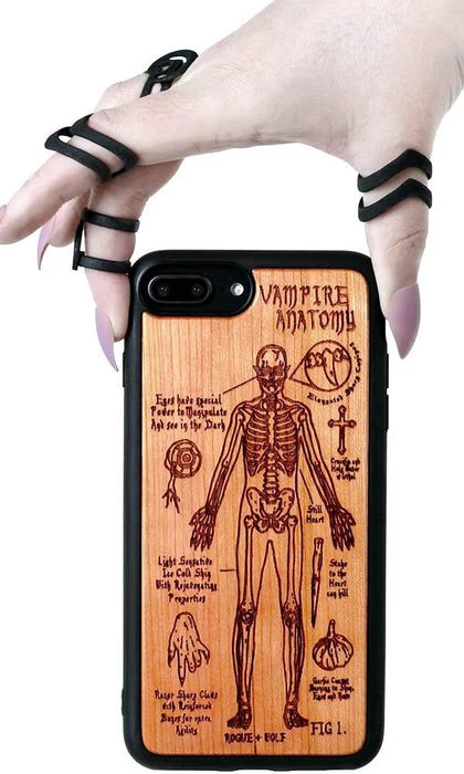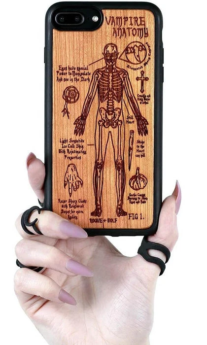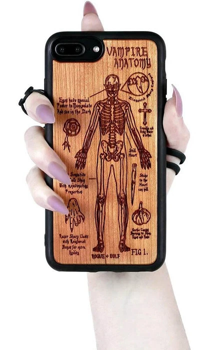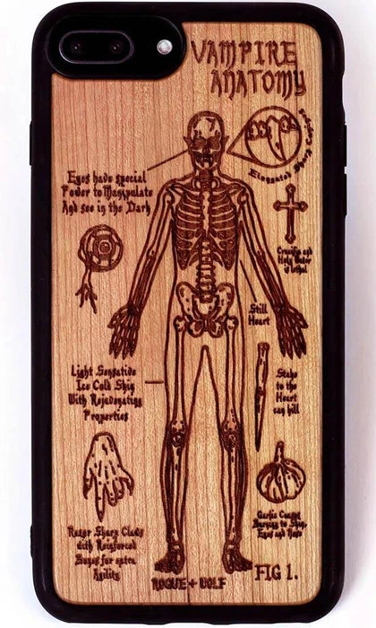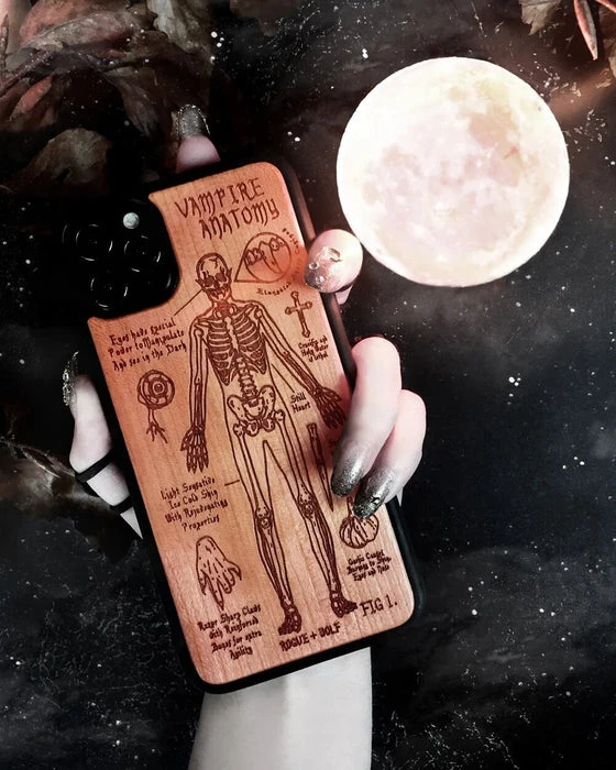 A Vampire’s Anatomy Wooden Phone Case engraved with an anatomical diagram of a creature of the night. Study it and study it well, it may just save your life!