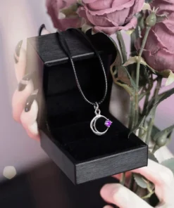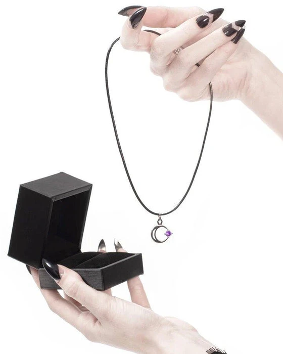 A Silver Mirror Polished Necklace with the crescent Moon gently caressing a single star. Adorned with a Violet Cubic Zirconia gemstone.