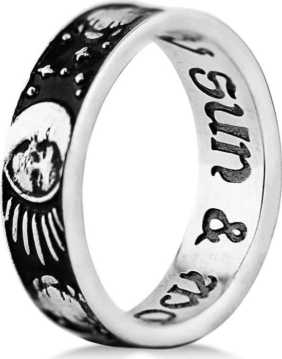 A Stainless Steel band 3D sculpted with suns and moons pushing aside clouds, hand-dyed black. “My Sun & Moon” inscribed within, to show someone how much they mean to you.